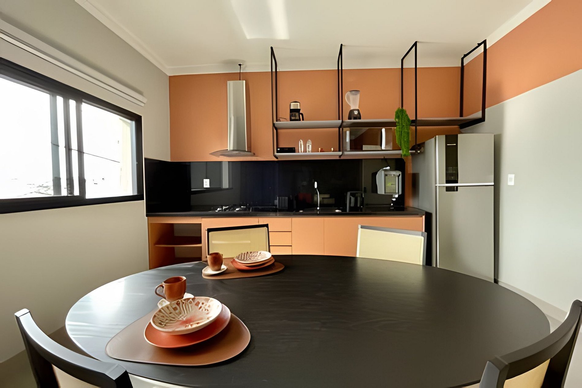 There is a table with 2 chairs for dining or working in a home office. The kitchen is fully equipped and has a 4-burner cooktop, electric oven, microwave, duplex stainless steel refrigerator, sandwich maker, coffee maker, water fountain and all the utensils to ensure a good stay.