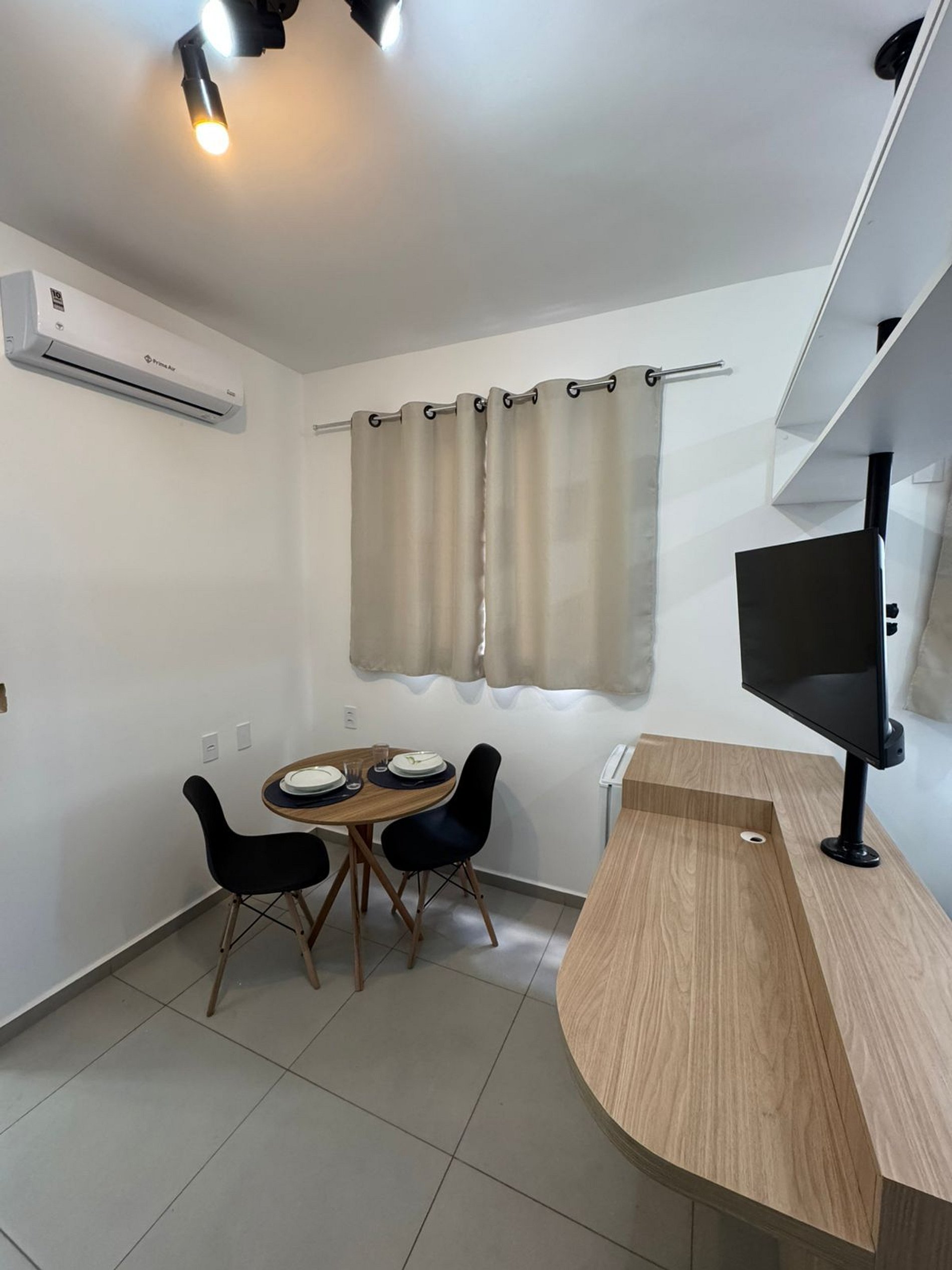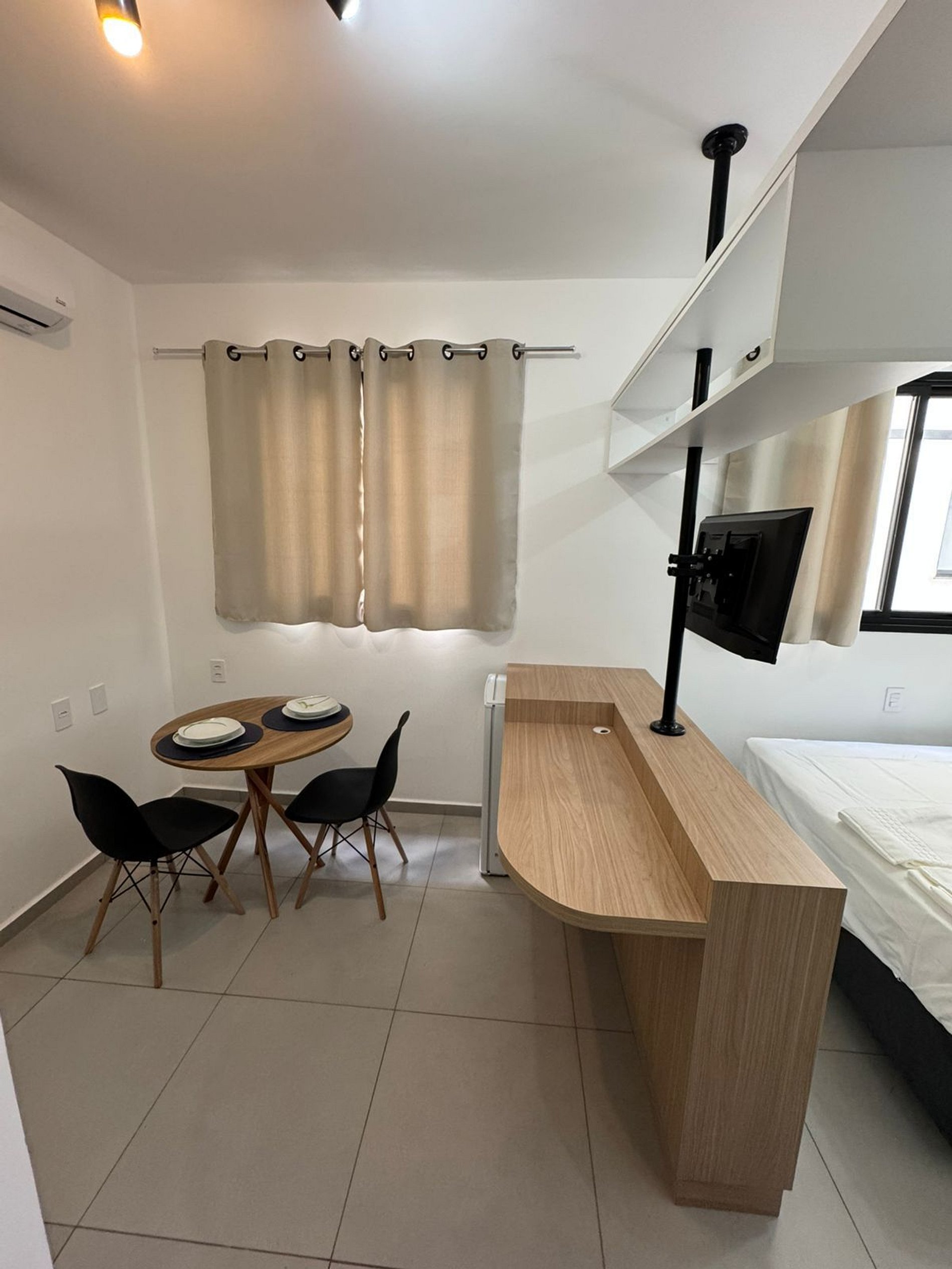 Conforto e Estilo: o ambiente oferece um colchão de casal super confortável, roupas de cama e toalhas brancas e macias, bancada multifuncional para estudos e refeições, com a Smart TV giratória, podendo ser usada em todos os ângulos do apartamento, além de um chuveiro com ótima pressão para um banho relaxante.