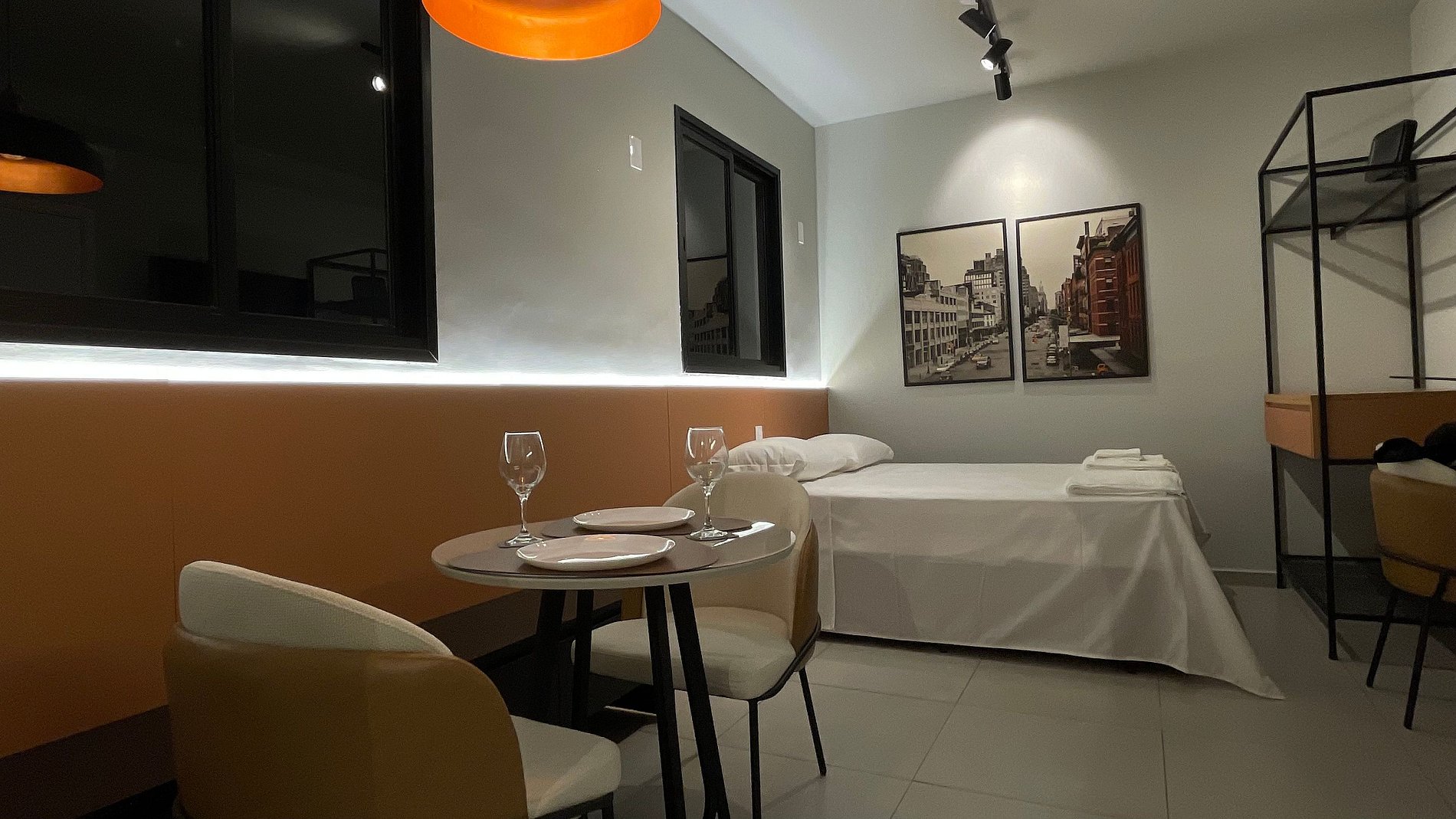 Conforto e Estilo: o ambiente oferece um colchão de casal super confortável, roupas de cama e toalhas brancas e macias, bancada multifuncional para estudos e refeições, com a Smart TV giratória, podendo ser usada em todos os ângulos do apartamento, além de um chuveiro com ótima pressão para um banho relaxante.