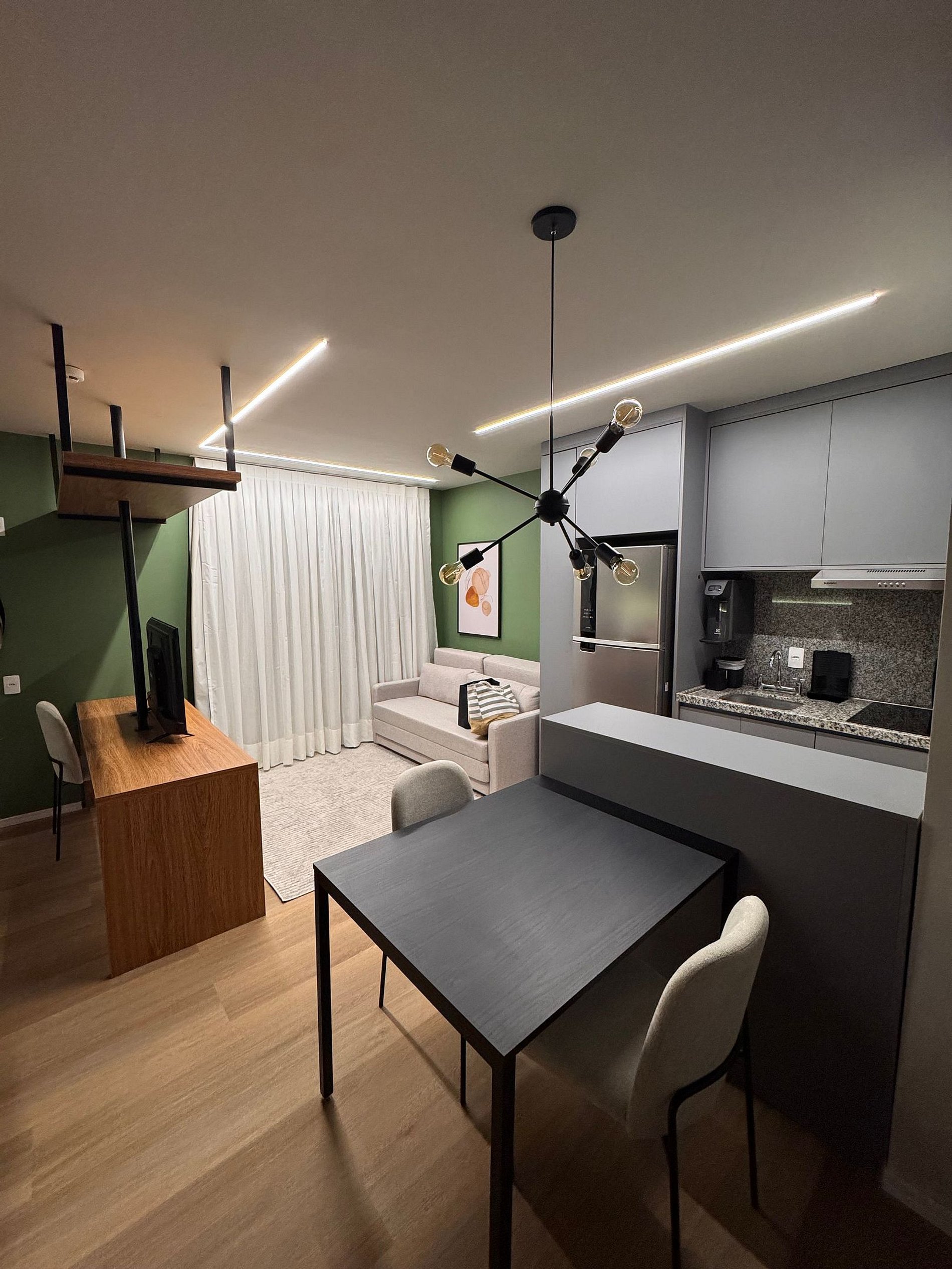 Nosso studio foi projetado para oferecer uma experiência moderna, confortável e funcional. Cada detalhe foi pensado para que o hóspede se sinta em casa, desde a decoração elegante e iluminação aconchegante até o piso vinílico amadeirado que traz sensação de conforto.