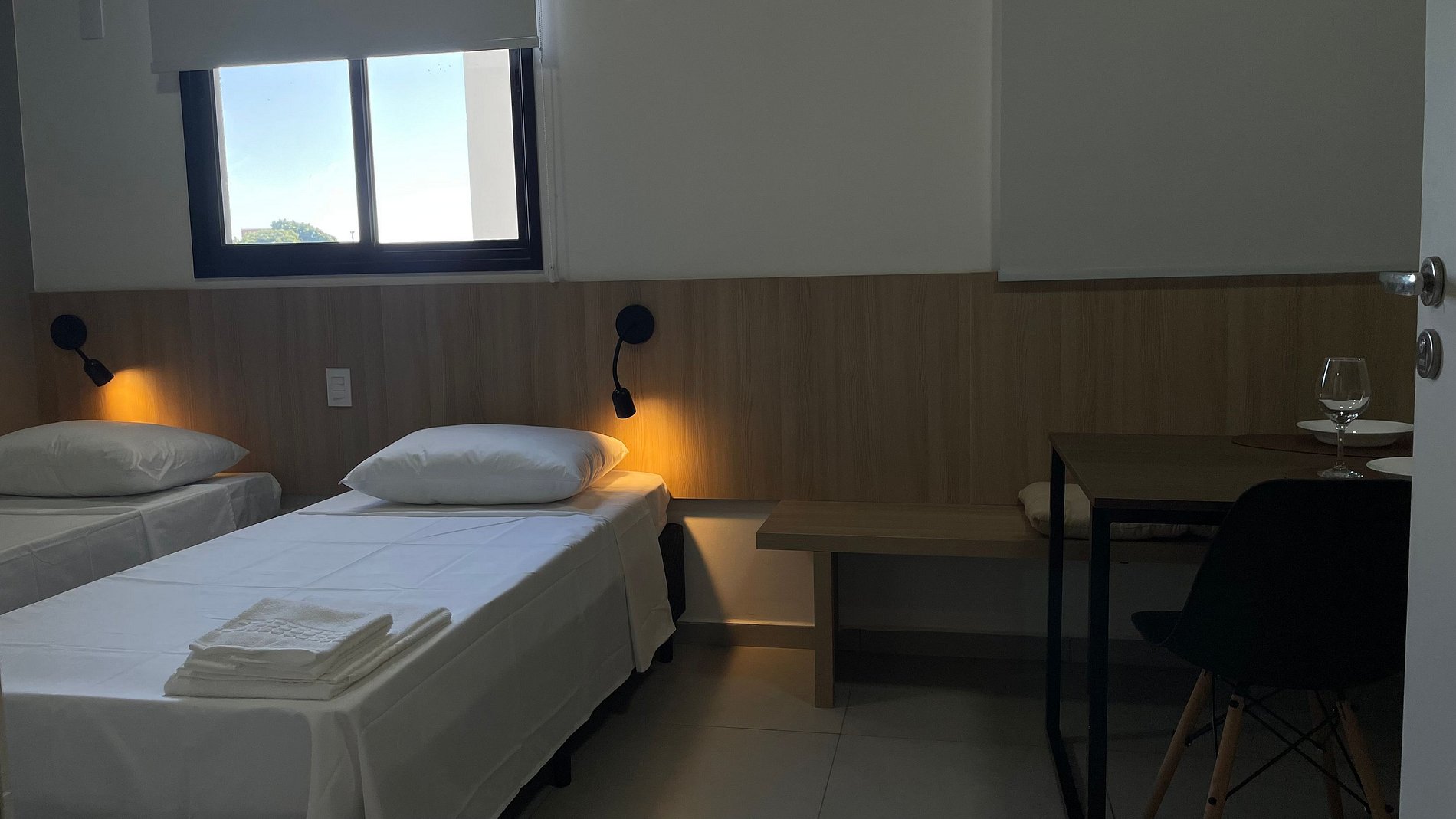 Conforto e Estilo: o ambiente oferece duas camas de solteiro, roupas de cama e toalhas brancas e macias, mesa multifuncional para estudos e refeições e um chuveiro com ótima pressão para um banho relaxante.