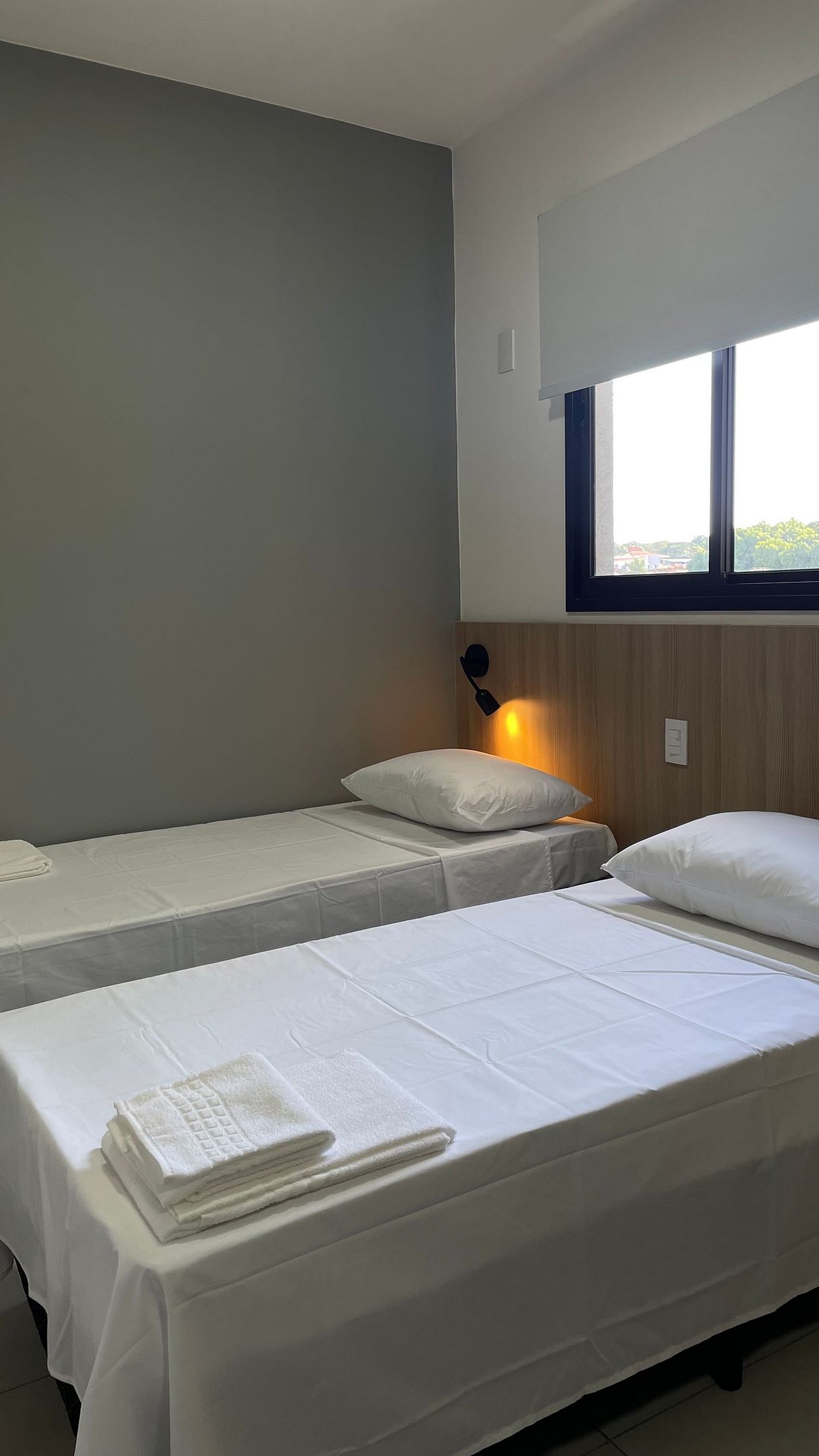 Conforto e Estilo: o ambiente oferece duas camas de solteiro, roupas de cama e toalhas brancas e macias, mesa multifuncional para estudos e refeições e um chuveiro com ótima pressão para um banho relaxante.
